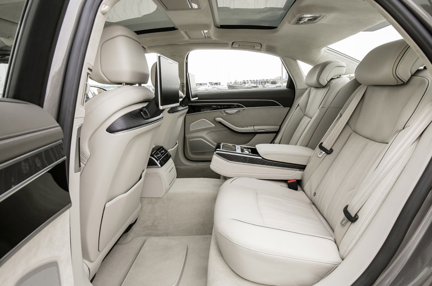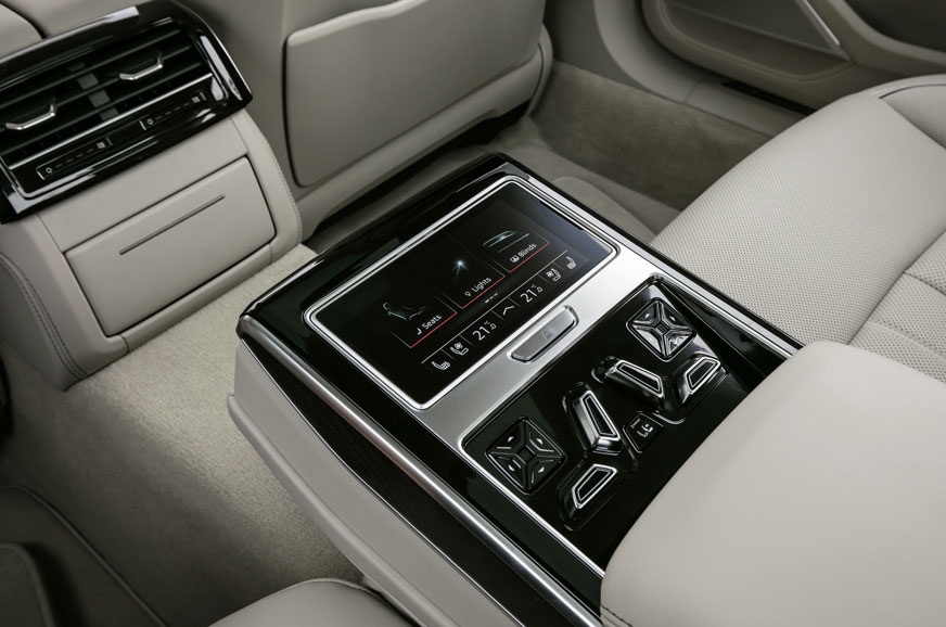 Being Audi’s flagship, quality of materials is absolutely top-notch and the leather surfaces, wood inlays and aluminium all exude fine craftsmanship. The three-seat rear setup is standard and can be had with a massage function as well as power adjustments for the backrest and seat base. But what is truly lounge-class is what Audi calls the relaxation seat. You can fully recline your seat, push the front passenger seat forward and then put your leg up on an electrically foldable surface to have your feet warmed and massaged. You’ve heard of Audi’s Matrix LED headlamps, well, the A8 has Matrix LED reading lamps at the back that let you control the size and hot spot of the light cone.