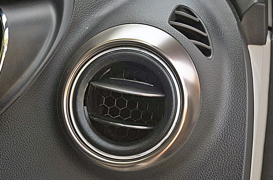 The front seats themselves aren’t too bad though. The two-tone white- and-black leatherette seats look and feel good, and there’s enough support for your back and under-thighs, as well as sufficient bolstering for your shoulders when tossing the car around corners. The design and similar contouring are seen on the rear seats as well. While two adults, or even three in a pinch, can sit fairly comfortably, the kneeroom is nothing to write home about, and the rising window line robs the back of some airiness. The rear cabin space also gets its own set of AC vents which should be useful on hot days.