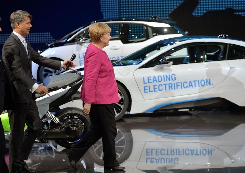 Harald Krueger, CEO of German carmaker BMW and the German Chancellor Angela Merkel pictured at the presentation with electric cars at the 2017 Frankfurt Auto Show (Photo by Thomas Lohnes/Getty Images)