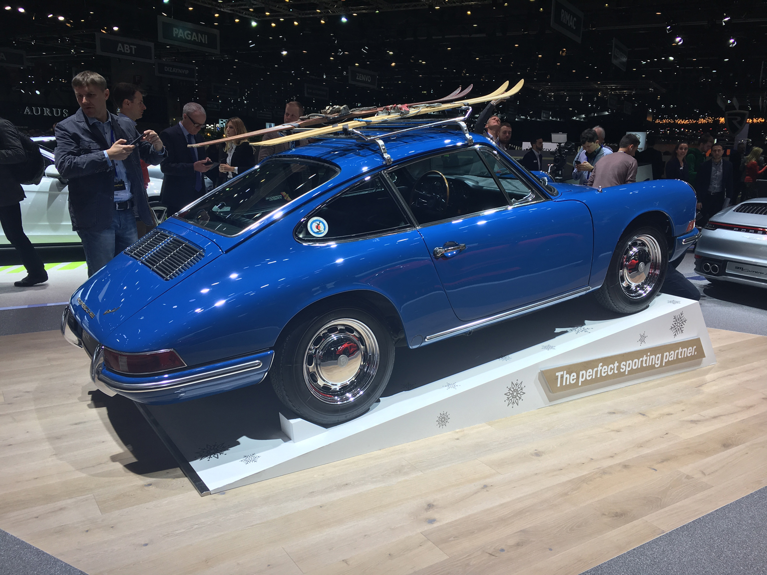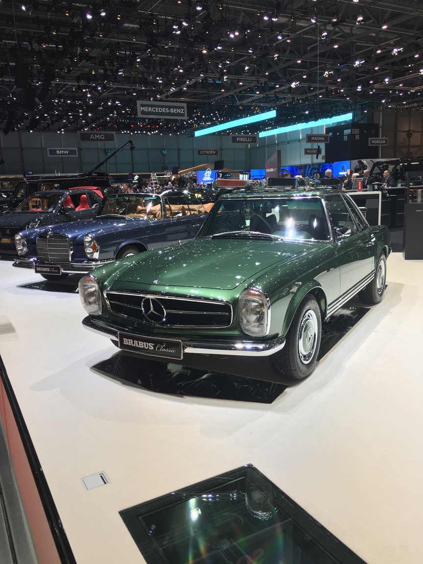 Hitting the slopes. Geneva is framed by the majestic Swiss Alps, known for their world-class skiing, and we found two cars sporting a vintage ski motif on the floor. The blue 1965 Porsche 9112.0 Coupe on the Porsche stand was pulled from the automaker’s museum to remind showgoers how the 911 has been used for a range of sporty pursuits. Bet folks back then had a lot of fun getting up the mountain. Mercedes tuner extraordinaire Brabus used a Mercedes-Benz 280SL Pagodaconvertible equipped with a ski rack and hard top to help promote its Brabus Classic restoration division.